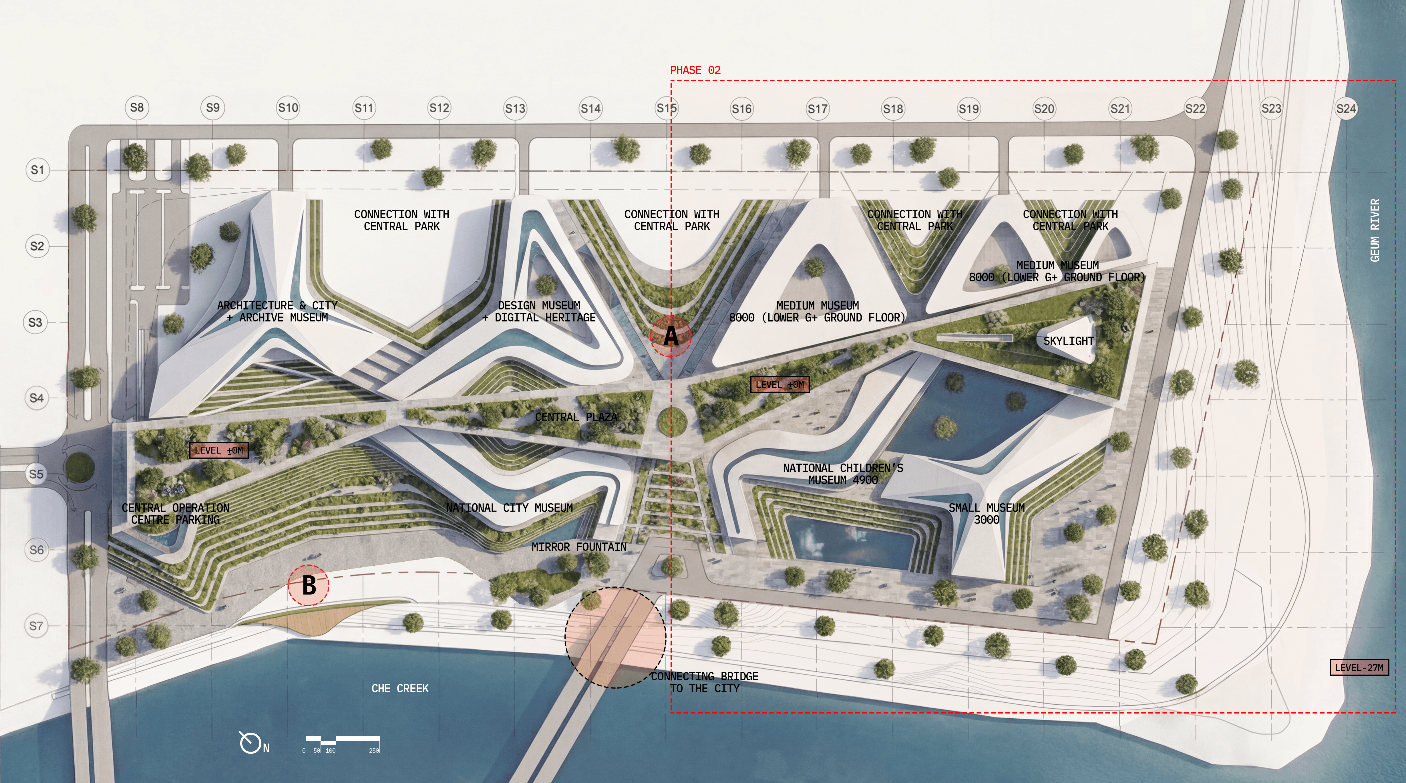 This competition proposal for the National Museum Complex in Sejong, South Korea is conceived as a cultural hub for the city. It establishes a connected museum landscape that brings together architecture, public space, and the riverfront into one coherent campus.